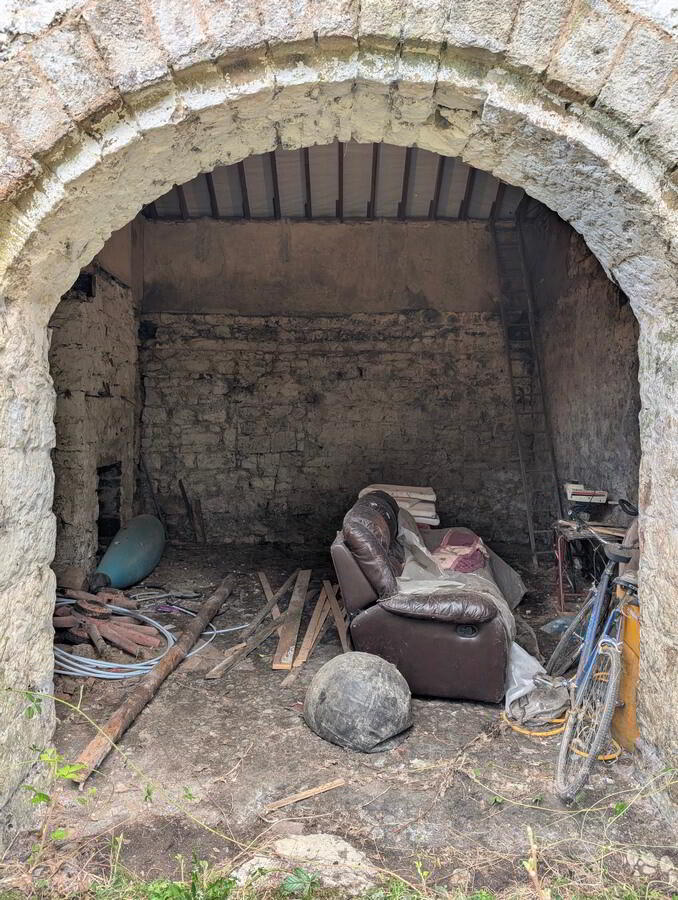 On the left side are the walls of a former animal house (5.7 x 4.5) and remains of other stone structures under vegetation.