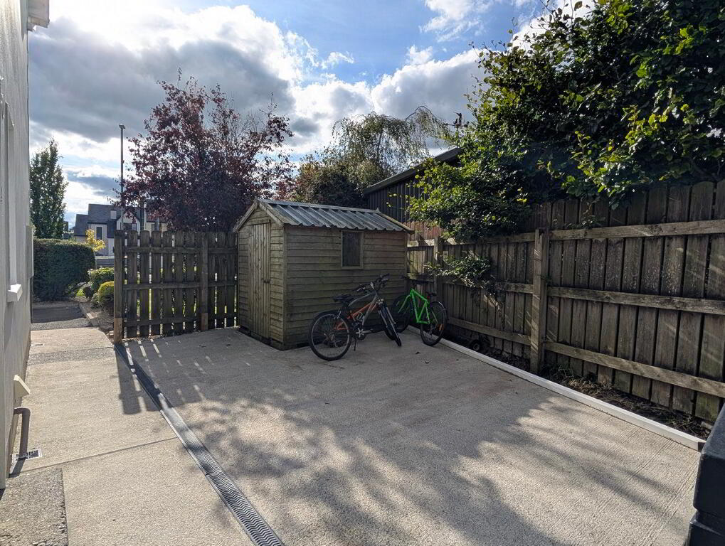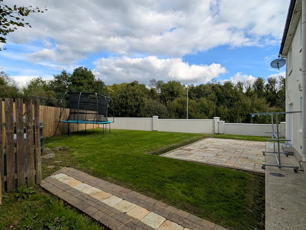 The clearly bounded corner lot is landscaped & exceptionally well maintained & affords ample off-street parking on the tarmacadam driveway bordered by flower beds & shrubbery. To the rear is a paved patio area & large lawn, this leads to a concreted side area with garden shed (6’ x 8’) & fuel store.