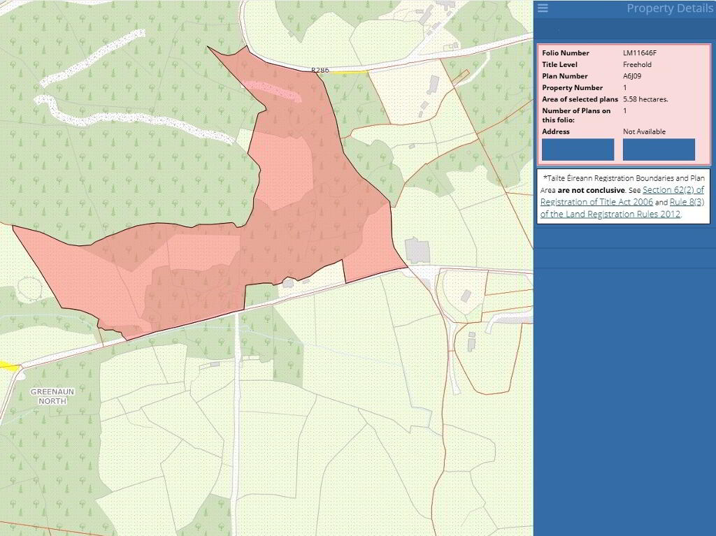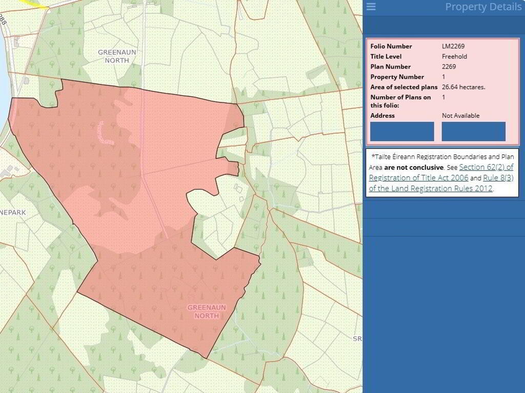 Folio LM2269; 26.64 ha/65.83 acres & Folio LM18463F; 29.29 ha/72.37 acres. This latter folio has C. 20.36 ha/50.31 acres directly adjoining LM2269 with the remaining C. 8.93 ha/22.07 acres parcel being under conifer plantation.