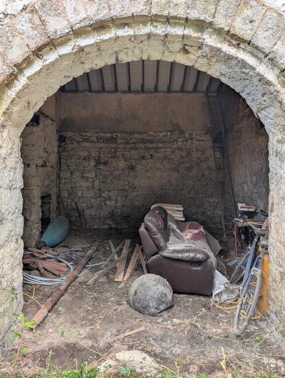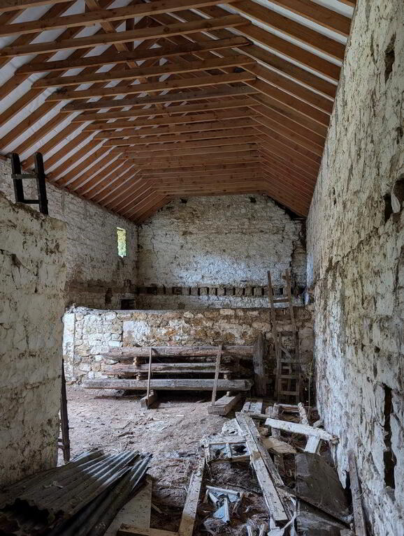 On the left side are the walls of a former animal house (5.7 x 4.5) and remains of other stone structures under vegetation.